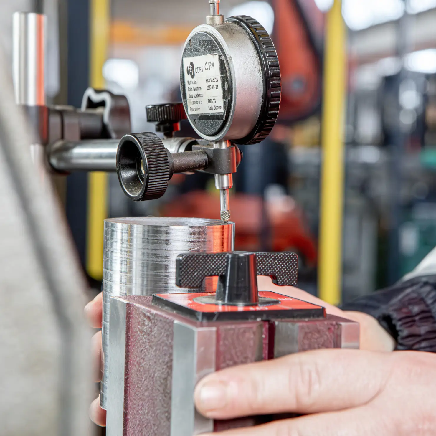 Sistema di scarico pezzi con robot antropomorfo e cambio contenitore automatizzato (4 contenitori); macchina di misura automatica per il controllo di lunghezza e perpendicolarità dei pezzi prodotti.